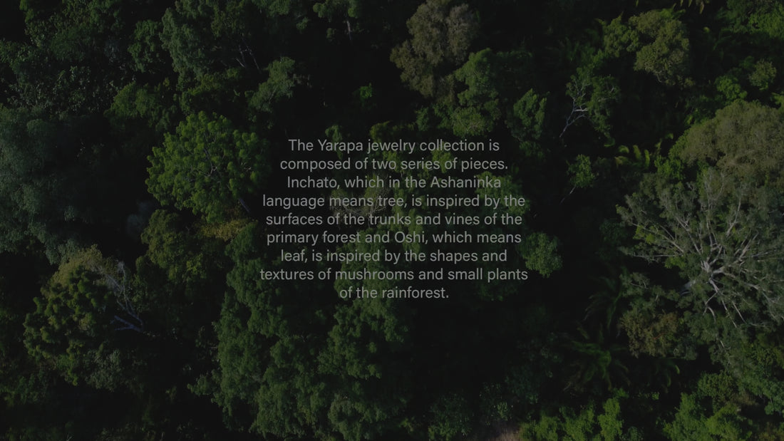 THE YARAPA JEWELRY COLLECTION IS COMPOSED OF TWO SERIES OF PIECES. INCHATO, WHICH IN THE ASHANINKA LANGUAGE MEANS TREE, IS INSPIRED BY THE SURFACES OF THE TRUNKS AND VINES OF THE PRIMARY FOREST, AND OSHI, WHICH MEANS LEAF, IS INSPIRED BY THE SHAPES AND TEXTURES OF MUSHROOMS AND SMALL PLANTS OF THE RAINFOREST.